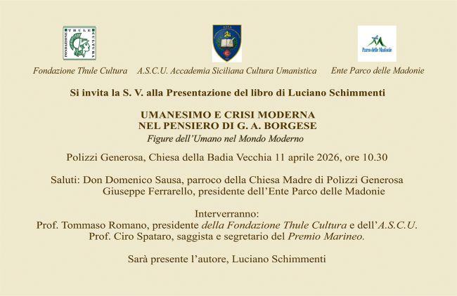 Presentazione del volume di Luciano Schimmenti "Umanesimo e crisi moderna nel pensiero fi G. A. Borgese". L'11 aprile 2026 a Polizzi Generosa (PA)