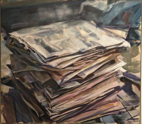 Umile e monumentale, la poesia del quotidiano si manifesta, ad esempio, nella pila polverosa di fasci e fogli: nelle piccole cose di ogni giorno si nascondono isole di segreto trionfo. Essi, accumulati uno sull’altro, ricevono la polvere ma anche il bacio della luce, trasformandosi in monumenti del tempo, pilastri cronologici.