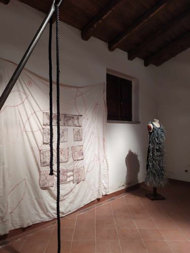 Fatta luce sulla metafisica della Fiber Art ossia sul fatto che l’arte del tessuto e dell’abbigliamento rivela la natura superiore dell’uomo, passiamo ad analizzare la mostra di Filly Cusenza, consistente in quella che si può considerare un’unica installazione, avente il bel titolo SPAZIO OLTRE, PUNTI DI DILATAZIONE DEL CORPO, mostra realizzata all’interno di uno dei corpi bassi di Villa Cattolica, sede del museo Guttuso.