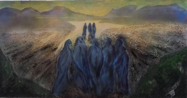 Ne L’alba del nuovo giorno, sono le figurine di quelle cinque donne in nero riprese di spalle ed indossanti il reclusorio burqa, mentre una loro compagna di sventura, forse più giovane in età, fa da battistrada nel cammino verso l’agognata, libertaria e liberalizzante luce dell’alba, ad evocare una salvifica e catartica via di fuga. Ben raggiungibile tra la rarefatta scena di un montagnoso paesaggio ove il concreto pericolo di pene e dolori plurisecolari, è ora ripristinabile dai talebani dopo la parentesi ventennale della fallita occidentalizzazione democratica della società afghana.