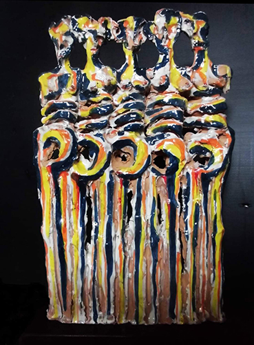 Sottolinea il codice nascosto nelle cose: quelle poche tracce che ne restano vengono disposte su supporti poveri ed essenziali. Non occorre la tela, basta il sacco. Non occorre il colore , ma basta la traccia di esso. Traccia sottolineata dal fondo bianco, l’unico lusso descrittivo che si concede. Tutti i suoi soggetti passano dal setaccio della sottrazione. E se è vero che meno è più (“less is more”, ci ha insegnato Mies van der Rohe) allora ecco spiegata la ricchezza sontuosa della sua esposizione, nella quale spiccano le sculture, opere maestre in bronzo caratterizzate da una ritmicità primigenia, quasi danze in schiera, memori di sirtaki mediterranei. Da sottolineare il folle Don Quijote, guerriero, filiforme, urlante.