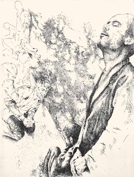 Ricostruire il cammino artistico di Guadagnuolo, significa seguirlo nei suoi incontri, non casuali né velleitari, con gli scrittori e poeti dei quali egli più che illustrare, interpreta visivamente le opere: l’unità di letteratura e di grafica, intesa, quest’ultima, in senso interpretativo e non di mera illustrazione, essendo il dono precipuo di Guadagnuolo pittore, disegnatore, incisore, che dopo la “Bottega dell’Orefice” del polacco Andrzej Javień, di cui tutti sanno il vero nome, diede alla luce un’altra cartella di acqueforti, dal titolo “Humanitas” ispirata allo Jedermann di Hugo von Hofmannsthal: la Leggenda di Ognuno, in cui il poeta austriaco, rielaborando un tema dell’antica letteratura inglese (e forse non senza l’ambizione di emulare il primo e il secondo Faust di Goethe), poetò la condizione nostra mortale, esposta a tentazioni d’ogni sorta. «Vorladung Jedermanns» («chiamata in giudizio di ciascun uomo» si potrebbe tradurre), questa di Hofmannsthal, che all’interno della sua preziosa materia scenica tiene celato molto di più («Der Stoff ist Kostbar von dem Spiel/Dahinter aber liegt noch viel»): un significato profondo che ognuno di noi deve ricavare riferendolo a se stesso. Un testo davvero congeniale al nostro Guadagnuolo: alla cui opera ben si potrebbero collocare in epigrafe i due versi del Prologo di Hofmannsthal che or ora ho citati: «Der Stoff ist Kostbar von dem Spiel/Dahinter aber liegt noch viel» – «Preziosa è la materia dello spettacolo/ ma molto di più si cela nel suo interno». E l’aggettivo prezioso, «kostbar» perfettamente si addice (cito da uno scritto di Vittorio Stella) «alla figuratività minuziosa, nitida, penetrante» con cui, in tutta la sua opera di acquafortista, Guadagnuolo restituisce «a ogni oggetto la sua dignità di forma entro quella forma che lo rappresenta»; così come il «molto di più» («noch viel») che in essa è racchiuso e spetta a noi decifrare come il segreto del nostro destino, è (cito ancora dallo scritto di Stella per la cartella “Humanitas”) la costanza dei simboli, delle allegorie – un materiale, posso ancora ripetere con Stella, «da inventariare, da mettere in rapporto, da connettere, forse, in un ulteriore processo che ne risolva l’attuale stato di proposizione interrogativa». “Humanitas” è del 1980. Due anni dopo, in una collettiva tenutasi alla Casa di Dante in Roma, e poi esposta in altre città, Guadagnuolo si cimenta con la Divina Commedia di Dante: ma nulla posso dire di quell’esposizione che coincise con una mia infermità non grave ma fastidiosa. Potei invece presenziare alla grande sua personale inaugurata in Palazzo Firenze, sede della «Dante Alighieri», da Giovanni Fallani, Salvatore Valitutti e Mario Scotti: i quali nel modo giusto commentarono, ciascuno dal proprio punto di vista (rispettivamente: critico-artistico; di significazione politica; storico-letterario) una nuova cartella di acqueforti ispirata alle commedie allegorico-politiche di Vittorio Alfieri: “L’Uno”, “I Pochi”, “I Troppi”, “L’Antidoto”. Ma sarebbe pleonasticamente ripetitivo enumerare qui la successiva produzione grafica del nostro Artista, per altro copiosamente documentata nella sezione apposita di questo stesso volume. Mi piace piuttosto sottolineare qualche passo del saggio breve quanto intenso (una sola pagina a stampa) che Ferruccio Ulivi (il quale più volte si è occupato di Guadagnuolo interprete grafico di San Francesco, di Manzoni) a suo tempo antepose al fascicolo che in occasione dell’uscita della cartella “Humanitas” raccolse, insieme con la riproduzione di varie sue opere, numerosi scritti sull’arte di Guadagnuolo; tra i quali quello di Vittorio Stella che ho citato poc’anzi.
