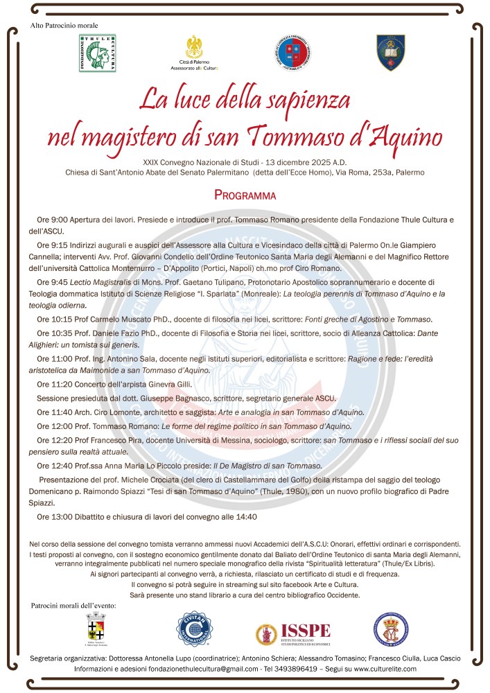 Programma del Convegno nazionale di Studi per celebrare l’attualità di san Tommaso d'Aquino nell' 800 anniversario della nascita. Il 13 Dicembre 2025 a Palermo